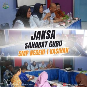 Kejaksaan Negeri (Kejari) Bantul melaksanakan program Jaksa Sahabat Guru pada SMP Negeri 1 Kasihan dengan narasumber Kasi Pidsus (Guntoro, SH.,MH), Kasubsi Pertimbangan Hukum (Destinar, SH) beserta Kasubsi Perdata dan TUN (Reta Rusyana P, SH).